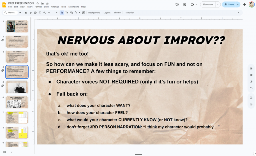The way I go about this is by first having conversations with each player directly to better understand not just what they want out of a D&D experience, but also to discuss what kind of art and stories they connect to. When I feel everyone is serious about the commitment and enthusiastic to go further, I’ll facilitate a get together where we talk as a group, and I’ll put on my “Session Zero” presentation. In this presentation, I cover some basic reminders about how to play D&D, an overview of our campaign world, and a whole section on how to relax into the play environment. Here’s an example from the slide titled “Nervous about Improv??”